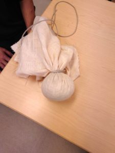 布で包んだハーブを丸めて縛って残った布で取っ手を作って・・・。