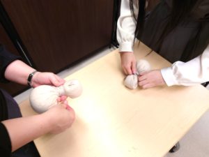 その後、水に浸したハーブボールを蒸して、実際に温熱マッサージに挑戦!