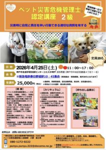 災害時(地震・火災など)、ペットと飼い主を避難誘導・救援等するため、飼い主の統率を取るスペシャリストとしての認定資格「ペット災害危機管理士(R)」